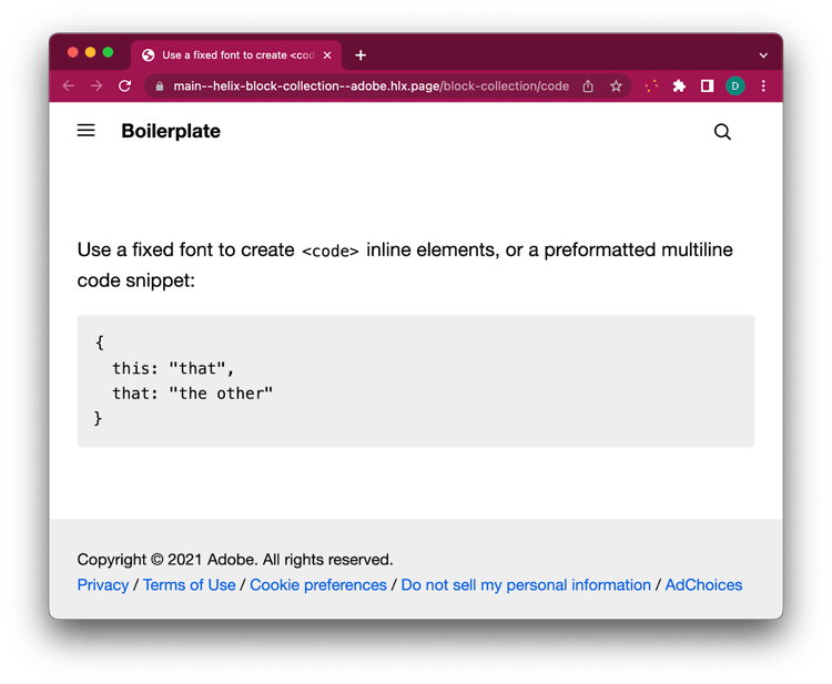 Most technical documentation websites (including this one) have the need to display code. Most marketing websites don’t have that requirement, but since there is an intuitive and simple styling and markup the notion of code elements both inline and preformatted multiline is supported out of the box.