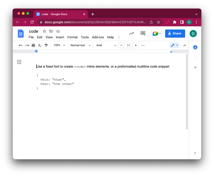 Formatting something in word or gdoc as a fixed font (eg. Courier New) will automatically output a <code> element or a <code> and <pre> block for multiline.