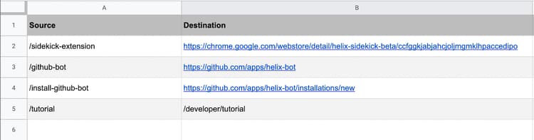 Remember that if your redirect workbook has multiple pages (worksheets), then the redirects will only work on the sheet that is called helix-default. This allows you to manage more complex redirects through spreadsheet formulas. The spreadsheets and JSON documentation page has all the details.
