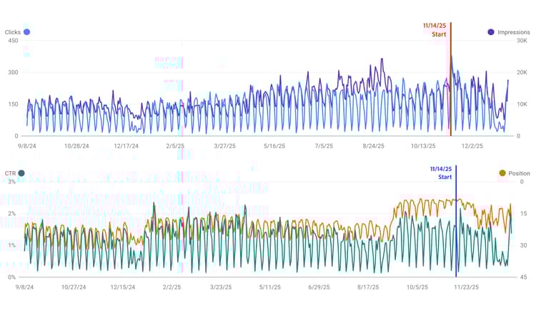 Execution: On November 14, 2025, we started including headers and footers on the server side on all of www.aem.live. The following charts show authoritative data from Google Search Console after 60 days of runtime: