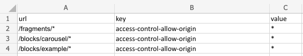 In some cases, it is useful to apply custom HTTP response headers to resources, for example to allow CORS. If you want to specify headers, create either an Excel Workbook or a Google Sheets Workbook in the /.helix folder of your website in Sharepoint or Google Drive called headers.xlsx in SharePoint or headers in Google Drive.